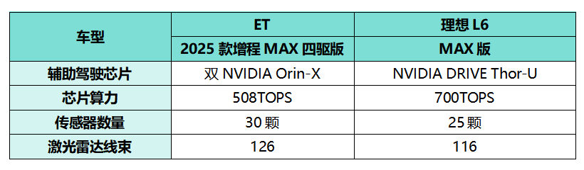 相较之下,两款车型均拥有出色的智能驾驶辅助体验,理想L6虽然芯片算力高,但ET的硬件配置更硬核全面,激光雷达线速更高。