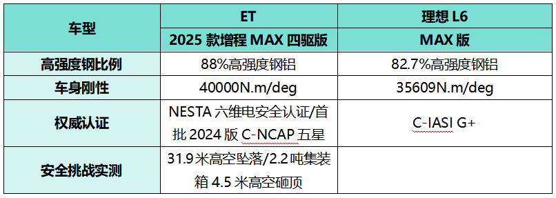 ET与理想L6搭建了强大的安全体系,其中ET用料更足、强度更高、抗扭能力更强,同时对于电池安全防护做到全面考量,创造更令人安心的安全出行体验。